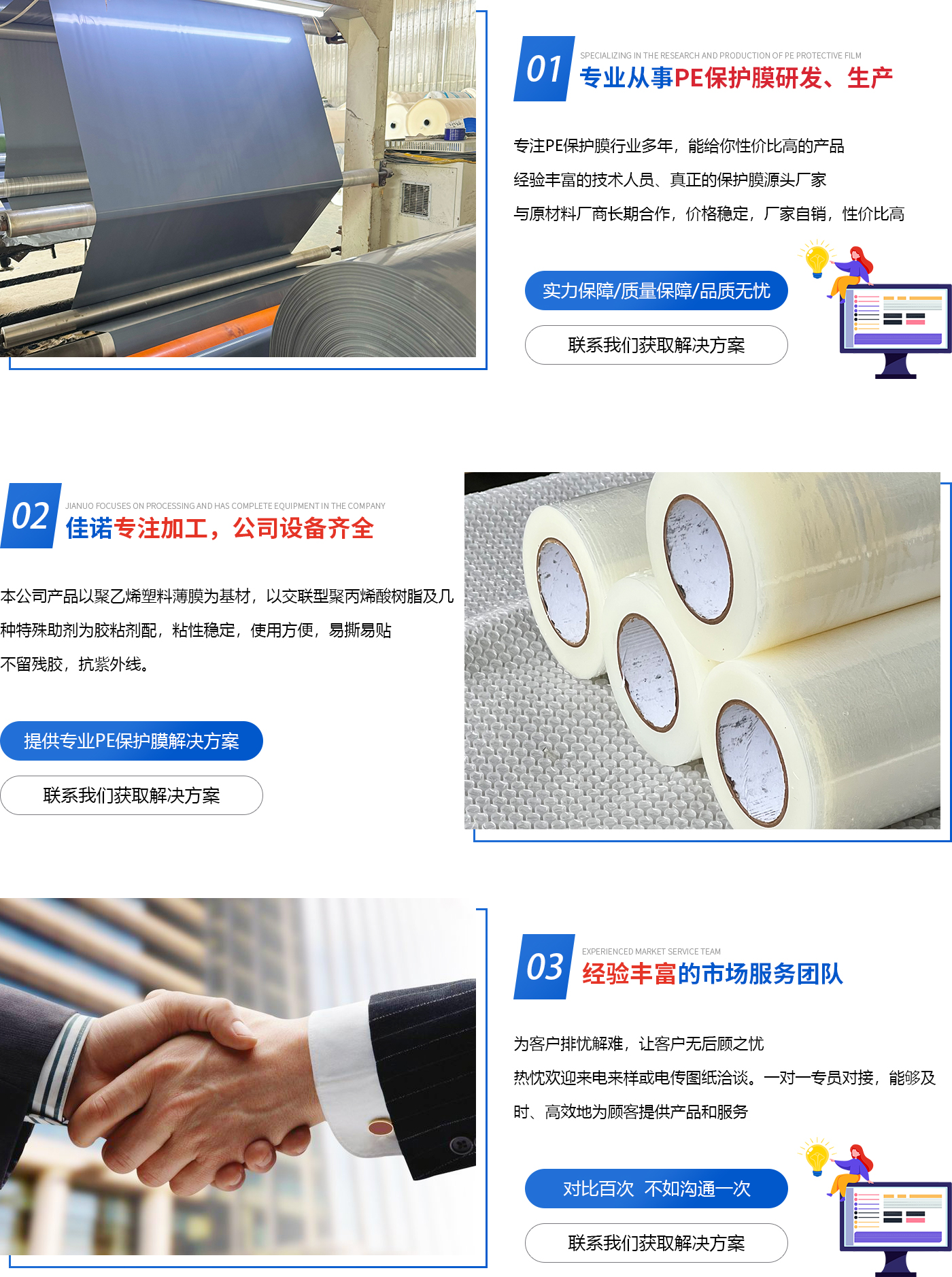 德州佳諾塑業有限公司生產防靜電自粘膜,包裝膜,筒子膜,原模,各種PE保護膜以及保護膜基材。公司生產保護膜、膠帶,是各類不銹鋼板、彩鋼板、鋁塑板、防火板、塑鋼型材、裝飾板、有機玻璃制品、漆面板、鏡面板、外墻板,保溫板,石英石,大理石,人造石,瓷磚,防盜門,木門,不銹鋼門窗,各種裝飾面板,各種建筑板材、地毯,以及電子、家用電器、家具、汽車制造,等行業不可缺少的表面保護材料。使被貼物在運輸、加工、貯存和使用過程中不受污染、腐蝕、劃傷,保護原有的光潔亮澤的表面,從而提高產品質量。 本公司產品用于鋁型材,PVC等材質型材保護膜,鋁門等鋁制品保護膜,鋁塑板,不繡鋼,鋁合金等產品表面保護膜,保護其在運輸途中,生產,安裝時對產品表面所造成的刮傷,灰塵等。可用于,汽車門,木地板,冰箱表面等家電及電子產品表面的保護。 基材:PE材質 粘性:低粘,中粘,高粘,特高粘 膜材:透明膜,藍膜,黑白膜,乳白膜 ( 除藍膜外,其...